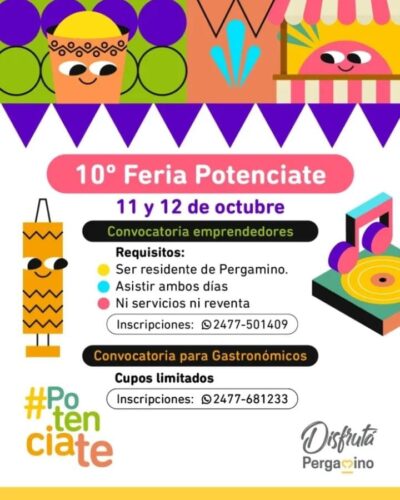 El sábado 11 y el domingo 12 de octubre el Parque España vuelve a recibir la feria de emprendedores más esperada de Pergamino. Llega la 10º edición de Potenciate, el evento que organiza el municipio para promover el trabajo de artesanos, gastronómicos y emprendedores locales y la convocatoria. El cupo disponible es de 120 stands de emprendedores y 15 puestos para gastronómicos.